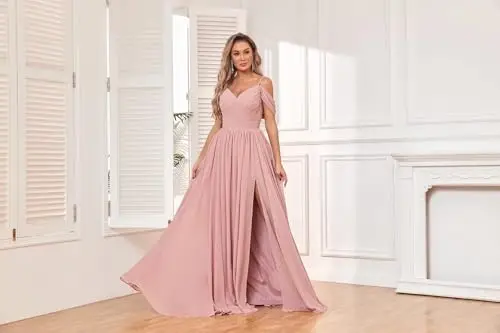 Classic Casual Off-The-Shoulder V-neck Backless Chiffon Floor-Length A-Line Evening Gown Lace Decoration Long Slit Bridesmaids